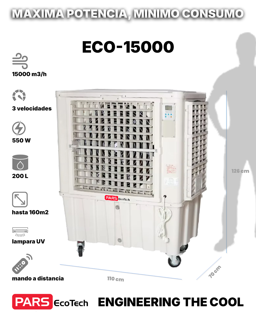 El ECO-15000 es un climatizador evaporativo de alta capacidad diseñado para ofrecer máximo rendimiento, eficiencia energética y gran autonomía, generando un flujo constante de aire fresco, humidificado y saludable. Con una cobertura de hasta 160 m², es una solución ideal para aplicaciones industriales, comerciales y de hostelería, tanto en espacios interiores como exteriores.