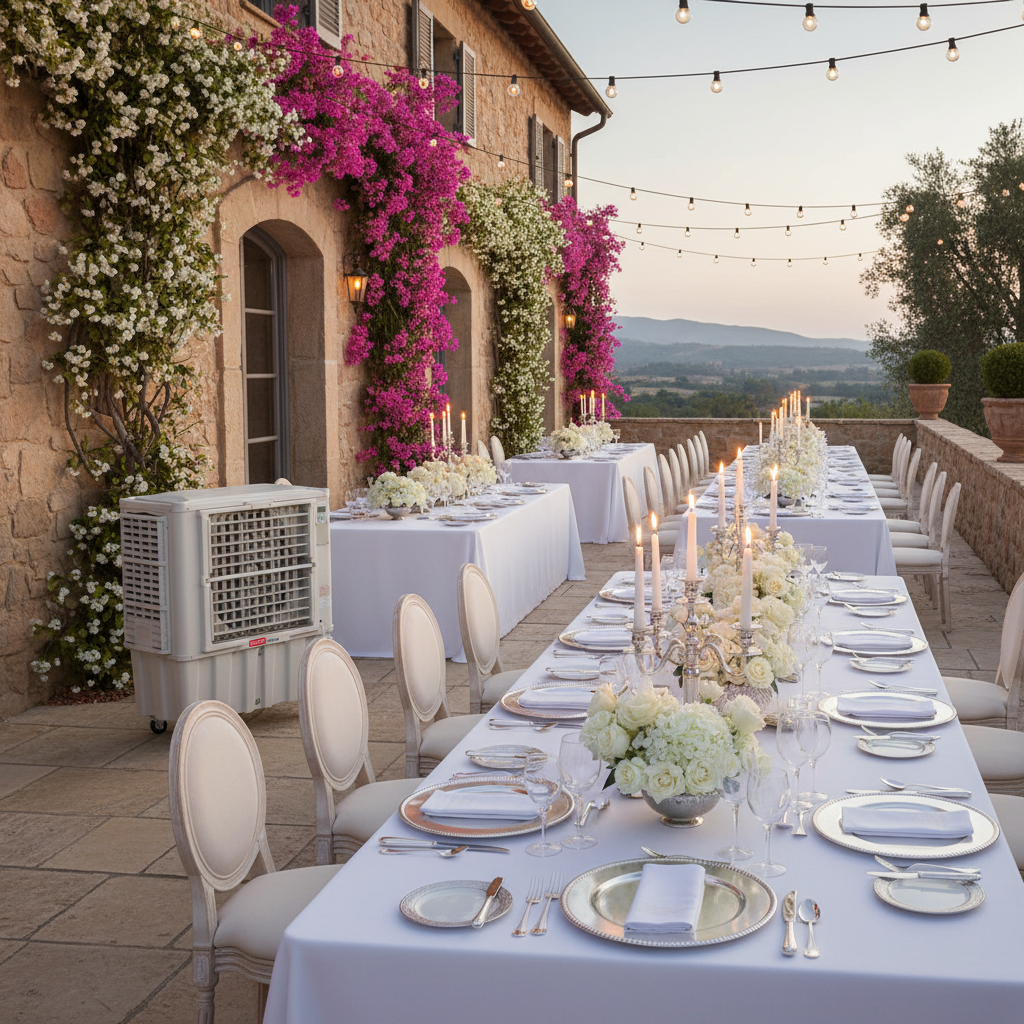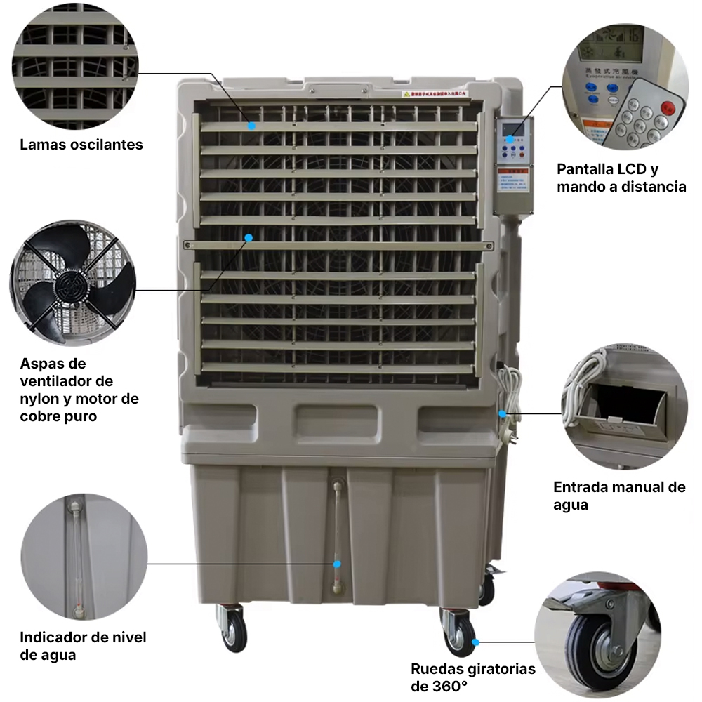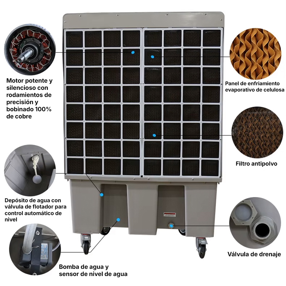 Uno de sus principales diferenciales es su sistema de aspiración de aire por tres lados (trasero y laterales), lo que incrementa significativamente la eficiencia del enfriamiento al maximizar el contacto del aire con los paneles húmedos. Esto se traduce en un mayor rendimiento térmico y una climatización más uniforme, incluso en condiciones exigentes. Además, incorpora un depósito de agua de gran capacidad (200 L), que permite largas horas de funcionamiento continuo con un consumo de 12–15 L/h, reduciendo la necesidad de recargas frecuentes. El suministro de agua puede realizarse de forma manual o mediante conexión directa a red, ofreciendo máxima comodidad operativa.