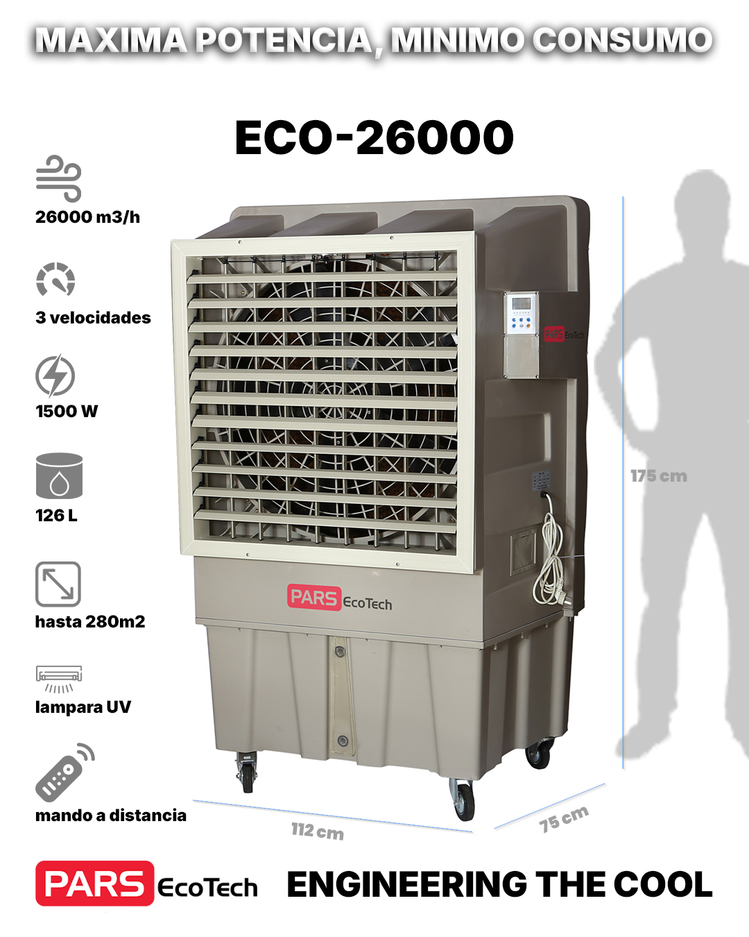 El ECO-26000 es el climatizador evaporativo más potente de PARS EcoTech, diseñado para ofrecer enfriamiento extremo, eficiente y continuo en espacios de hasta 280 m². Este modelo es ideal para entornos industriales muy exigentes, incluyendo grandes fábricas, naves industriales, talleres pesados, sitios de construcción y proyectos de gran escala, donde se requiere un flujo de aire constante y una climatización uniforme en áreas extremadamente grandes.