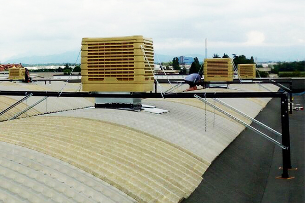 Climatizador evaporativo modelo ECOroof-10.000, que reduce las altas temperaturas de una manera eficiente energéticamente, emitiendo un aire fresco, húmedo y sano. Refrigera áreas de hasta 100 m2 por lo que es ideal para viviendas y naves industriales. Para refrescar superficies superiores, se pueden usar varios, lo que permite un reparto mejor del flujo de aire y mejor armonía de la temperatura.
