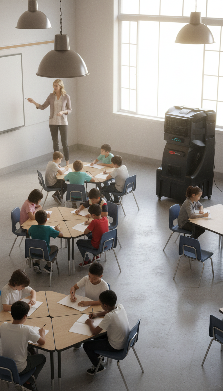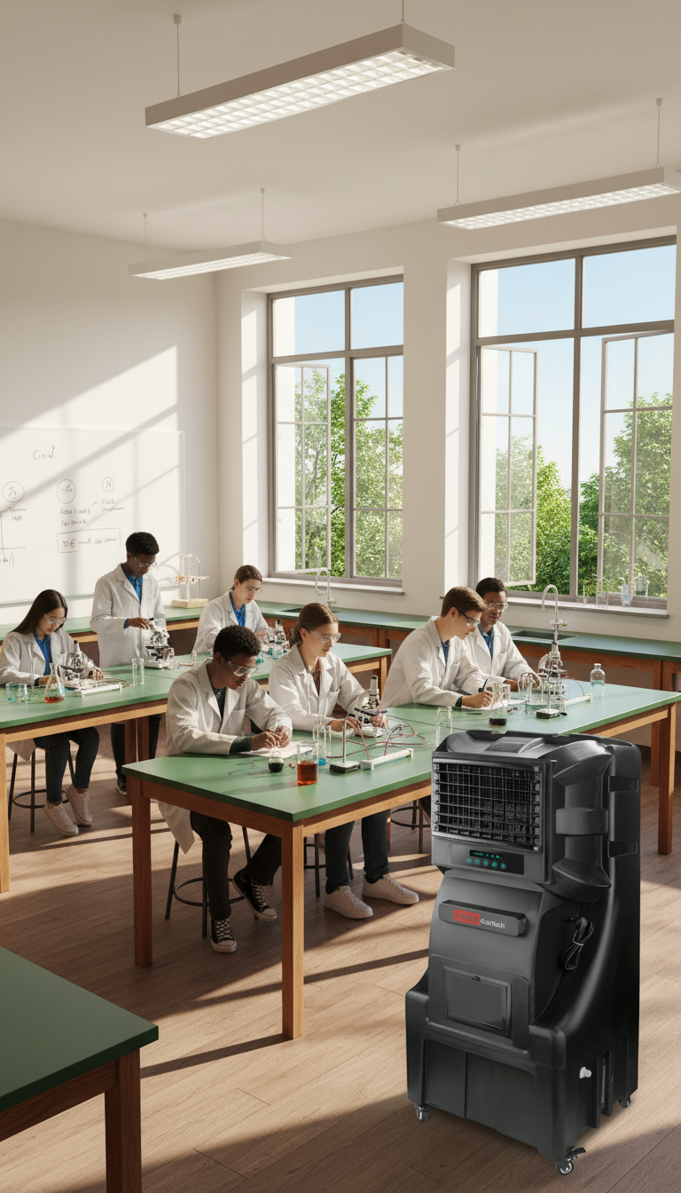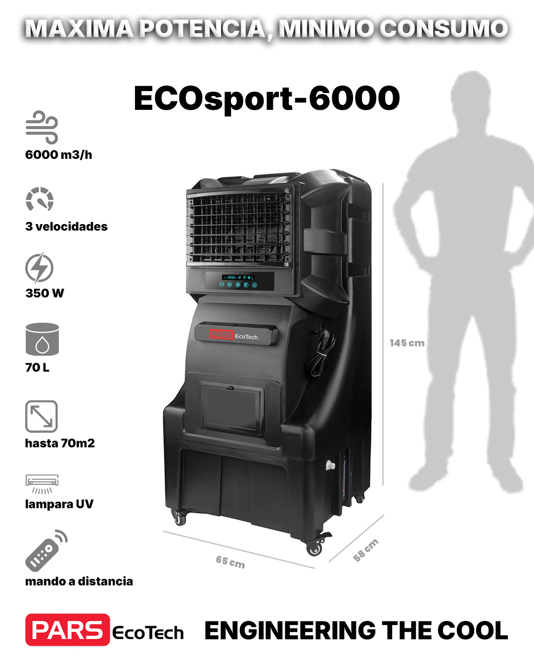 Compacto y ligero (65 x 58 x 145 cm, 33 kg), el ECOsport-6000 es ideal para salones, terrazas, oficinas, residencias, aulas de escuelas, tiendas y estadios deportivos, ofreciendo enfriamiento eficiente y confiable en una amplia variedad de entornos, con certificación CE/ETL que respalda diseño, rendimiento y seguridad.