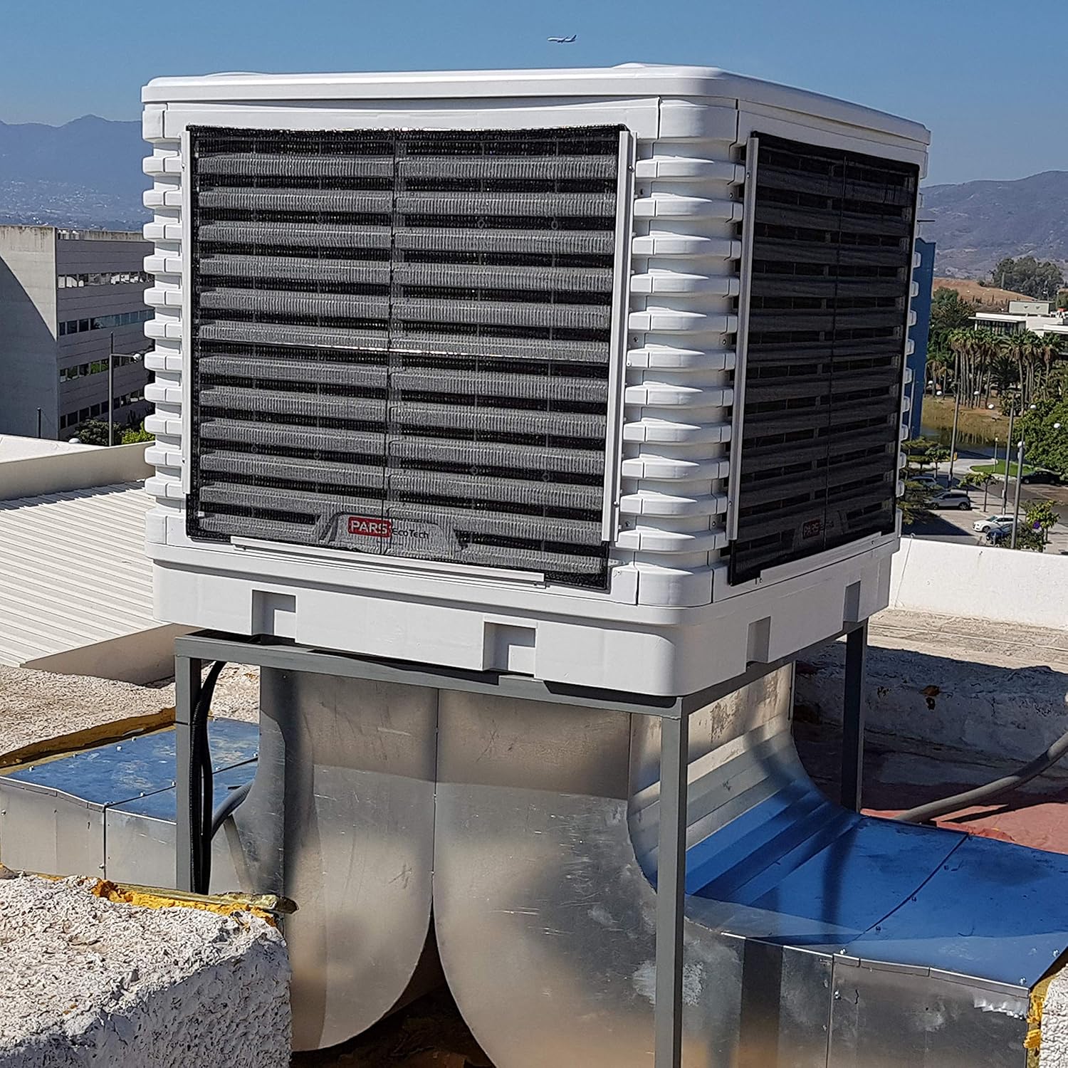 Climatizador evaporativo modelo ECOROOF-30.000, que reduce las altas temperaturas de una manera eficiente energéticamente, emitiendo un aire fresco, húmedo y sano. Refrigera áreas de hasta 250m2 por lo que es ideal para naves industriales. Para refrescar superficies superiores, se pueden usar varios, lo que permite un reparto mejor del flujo de aire y mejor armonía de la temperatura.