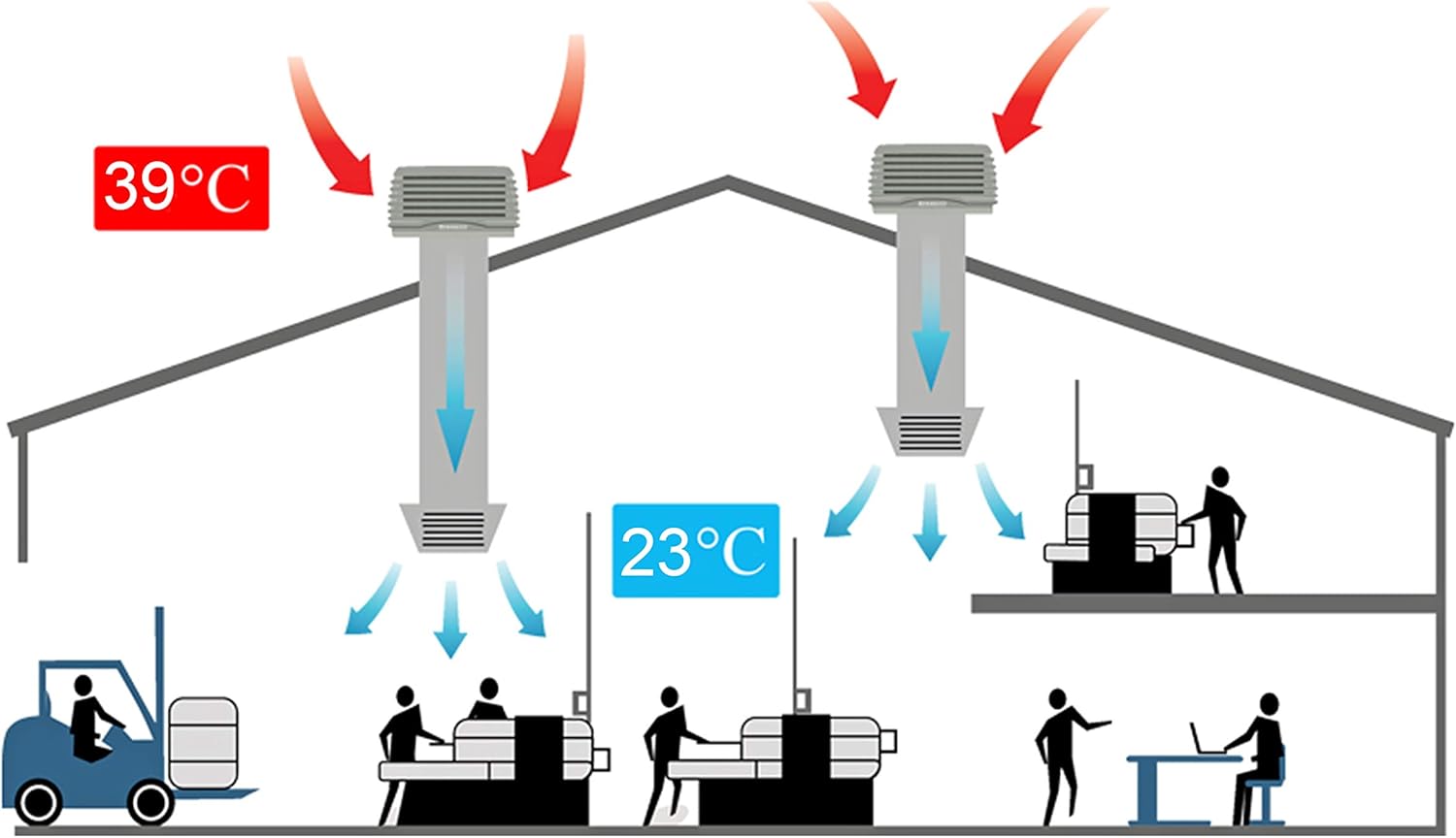 Refrigera áreas de hasta 250m2. Para instalar sobre tejado y reparto de aire por conductos. Perfecto para naves industriales.